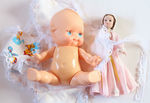 Тело - пластик, голова, ручки и ножки - плотная резина.Малыш завёрнут во фланелевый конвертик, который завязывается на кружевные ленточки, внутри малыш одет во фланелевый простой костюмчик из той же ткани, обшитый кружевом.