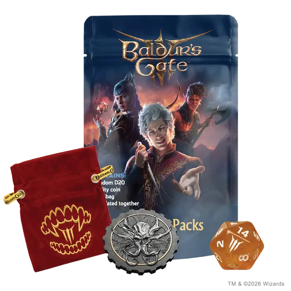 В каждом наборе Baldur's Gate 3 Treasure Packs есть рандомизированная комбинация кубиков и других аксессуаров с изображением знаковых моментов и персонажей видеоигры. Благодаря различным уровням редкости и эксклюзивному варианту сюрприза, каждый заказ подобен броску кости. Мешочки-сюрпризы впечатляют не меньше, чем сама игра!