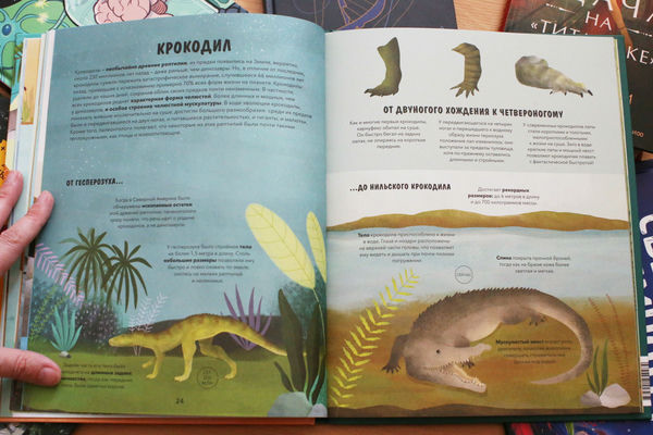 На каждом развороте сразу показано древнее животное, от которого происходит современное, мы следим за путем эволюции по стрелкам, наблюдая переходные формы. Невероятно увлекательно! Эволюция объясняется четко и ясно, рассказывается об изменениях, с которыми столкнулось каждое животное, прежде чем стать таким, как оно есть в настоящее время.