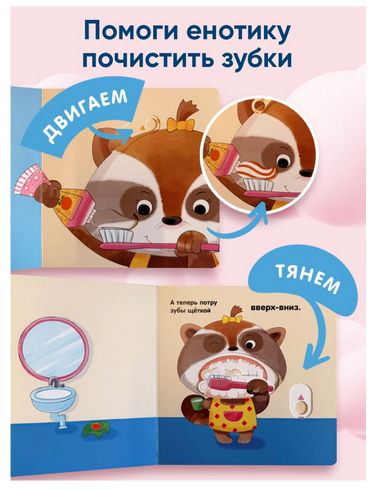 Серия книг о полезных привычках с подвижными деталями и интерактивными элементами для малышей! Яркие и выразительные иллюстрации и интересные детали превращают чтение в захватывающую игру. Малыш сможет тянуть выдвижные панельки, крутить детальки и открывать окошки.