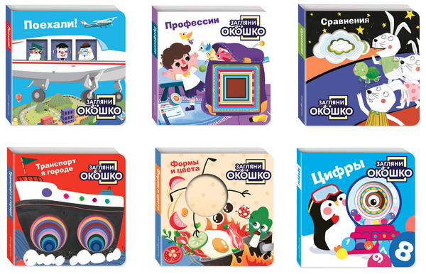 В серии доступны: Озорная кошка, Поехали!, Профессии, Сравнения, Транспорт в городе, Формы и цвета, Цифры.