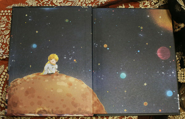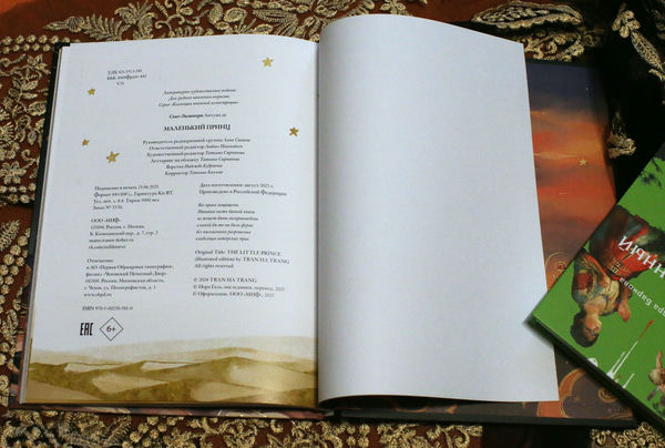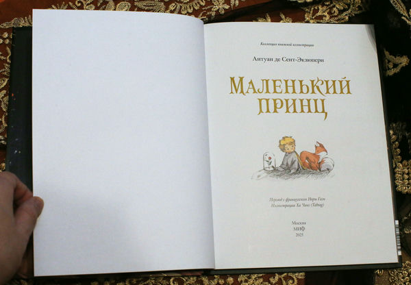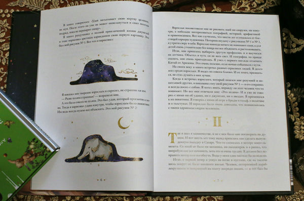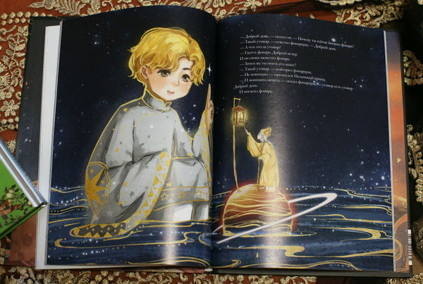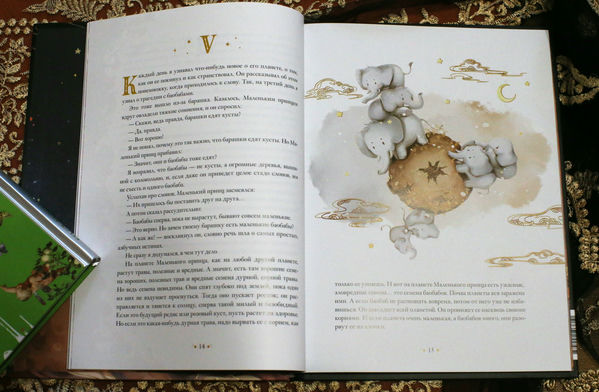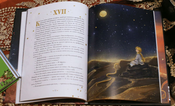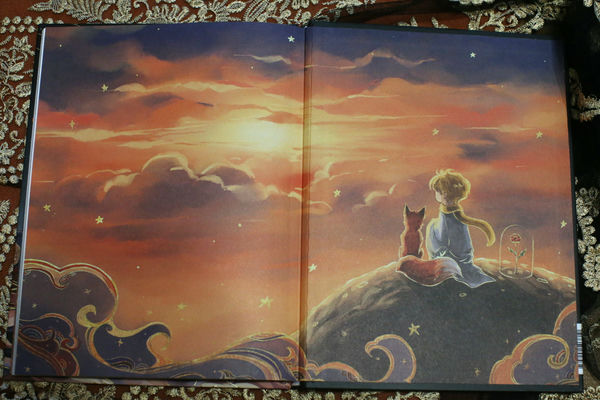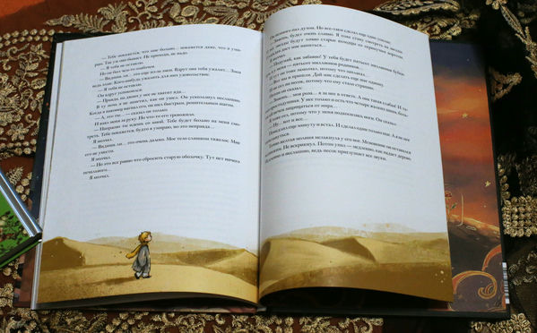 Визуальное впечатление от этой книги - потрясающее. А еще нам очень нравится то, как бережно передана вся история в иллюстрациях, не нарушая знакомый нам канон. Слон в змее, роза, сам принц и другие элементы - они здесь словно хорошо знакомые друзья, но в новом праздничном облачении. Рассматривать иллюстрации невероятно интересно.