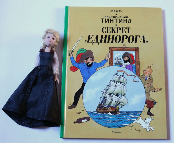 Приключения Тинтина: Секрет "Единорога", книга рядом с 18-см куклой.