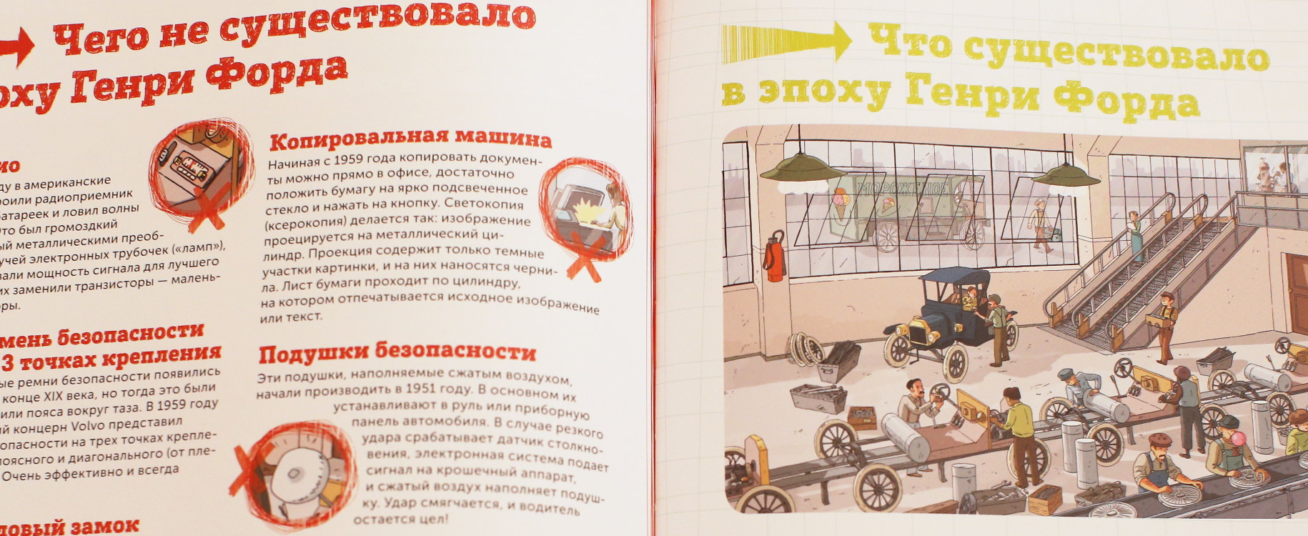 Каждая эпоха представлена двумя разворотами: сначала полностраничная иллюстрация с подвохами, а затем появления. Почему этого ещё не существует и когда оно было придумано?