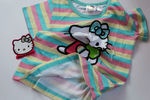 Футболка полосатая, с картинкой Hello Kitty, 100% хлопок. Она чуть тоньше, чем футболки из предыдущего набора, идеально на лето. Очень понравилось, что Китти - не принт (принты такого размера грубоваты на ощупь), а рисунок на ткани, как и полоски. Поэтому вся футболка очень мягкая, принт на облезет, потому что это не принт. :-)