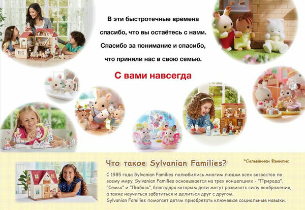 С 1985 года Sylvanian Families полюбились многим людям всех возрастов по всему миру. Sylvanian Families основывается на трех концепциях - "Природа", "Семья" и "Любовь", благодаря которым дети могут развивать силу воображения, а также научиться заботиться и делиться друг с другом.