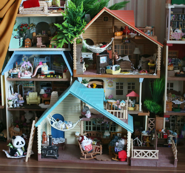 У нас три дома, на столе, я бы еще купила домики, но некуда. И друг на друга такие не поставить. 😳