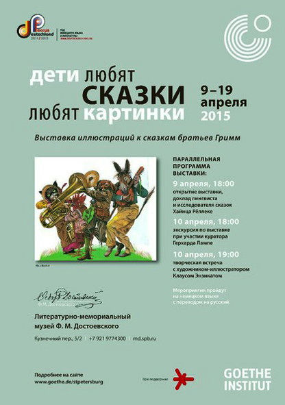 В рамках Года немецкого языка и литературы в России 2014/2015 с 9 по 20 апреля 2015 года Гёте-институт в Санкт-Петербурге представит в Литературно-мемориальном музее Ф. М. Достоевского выставку иллюстраций к сказкам братьев Гримм «дети любят СКАЗКИ любят картинки».