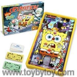 - набор Операционная с Бобом (на фото справа), около 25 долларов - Operation Spongebob Edition. SpongeBob Squarepants is trapped in Plankton's lab, with 12 different ailments to make him blab! You must help your Bikini Bottom buddy keep the Krabby Patty recipe a secret. Perform delicate undersea surgery on his Barnacle Brain, Clammy Hands and Patty Pleasure Center without setting off the electronic buzzer. The surgeon with the steadiest hands earns the most pay and saves the day. Includes a gameboard with SpongeBob SquarePants "patient" and tweezers, 12 plastic Funatomy parts, 24 cards, play money and rules.
