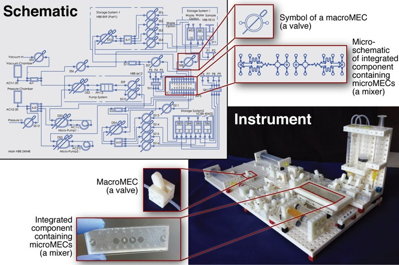 Как указано в новой статье в PLOS One, блоки, известные как “эволюционные компоненты мультифлюидик” (кратко - просто MEC: Multifluidic Evolutionary Components) адаптируемы к множеству различных применений. Каждый блок соответствует определённой общей задаче, которую биоинженерам нужно проанализировать в лаборатории, и они могут быть объединены различными способами, чтобы приспособить окончательной аппарат к нуждам исследователя.