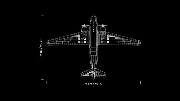 Размеры LEGO Douglas DC-3 впечатляют: размах крыльев составляет 76 см, а длина самолета от носа до хвоста - 51 см.