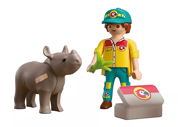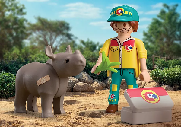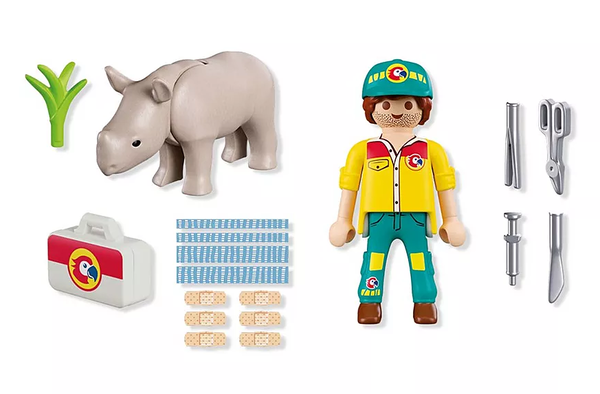 Заботливый смотритель ухаживает за раненым детенышем носорога и уделяет ему внимание. Благодаря чемоданчику врача, специальной подкладке и перевязочному материалу игровой процесс становится добрым. Сострадание занимает центральное место в этой сцене. Дети помогают смотрителю ухаживать за маленьким носорогом и лечить его, могут накладывать повязки, готовить корм и улучшать состояние животного. Движущиеся детали оживляют игру и приглашают воссоздать события в зоопарке.