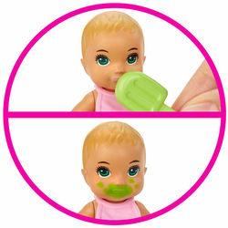 Куклы и игровые наборы Barbie Skipper Babysitters Inc. позволяют детям проявить свою заботу – этот тематический набор для кормления и купания позволяет им побыть в роли няни с помощью веселых ролевых игр. У очаровательной куколки есть функция менять цвет лица, превращая его из грязного в чистое и обратно. Опустите зеленое фруктовое мороженое в холодную воду и "скормите" малышу. Наполните ванну в форме кита теплой водой и с помощью мочалки протрите лицо. Затем вытрите ее и оденьте куклу в полотенце в форме милой уточки!
