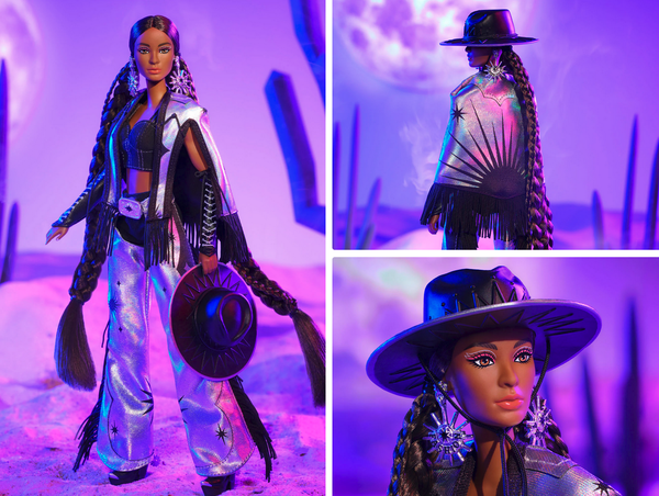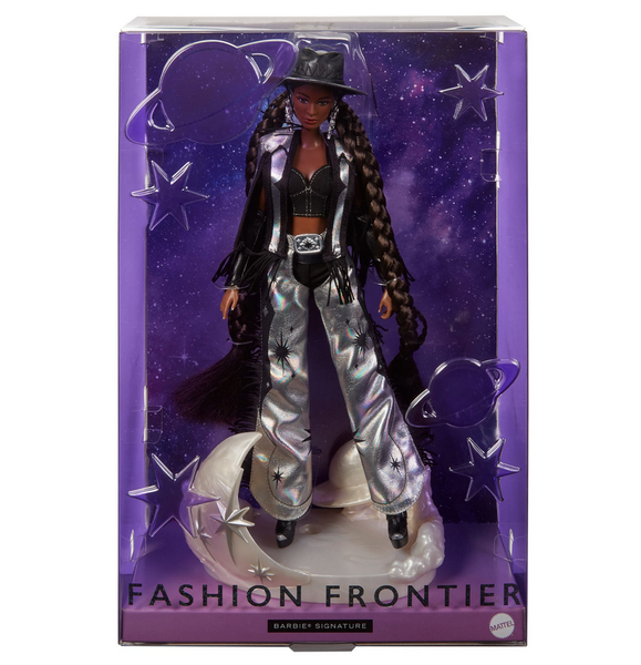 В коллекции Barbie Fashion Frontier представлены наряды в стиле "не от мира сего", в которых сочетаются Дикий Запад и космический шик, создавая совершенно новый образ. Вторая кукла из серии блистает в образе, вдохновленном ночным небом, в черной укороченной майке, накидке с мерцающей бахромой и таких же серебристых штанах с узором в виде звездочек. Она подчеркивает небесный стиль с помощью ремня с пряжкой из горного хрусталя, кожаных манжет на рукавах и широкополой шляпы, которые мгновенно возносят ее до звездного статуса.