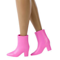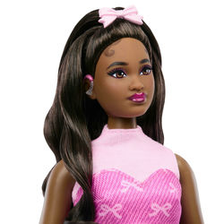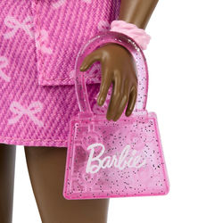 У этой куклы Барби пышное телосложение, и она носит слуховой аппарат! Ее комплект из топа и юбки из розовой джинсовой ткани украшен бантиком и карманом-карго. Ее волнистые черные волосы уложены в прическу, украшенную пастельно-розовым бантом. Браслет-бант из бисера и ботильоны пурпурного цвета придают ее образу особую изысканность. Главным аксессуаром является сумочка с логотипом Barbie, украшенная бриллиантовой вставкой. Гибкие суставы позволяют ей принимать самые разные позы с сумочкой в руках!