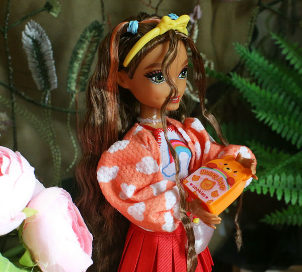 Барби Dream Besties. Персонажа легко узнать по ямочкам на щеках, волосам и красной гамме наряда.