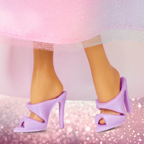 На кукле атласное платье с радужным градиентом пастельных тонов и тюлевой накладкой; тюлевые вставки на рукавах придают мечтательному праздничному образу изюминку.