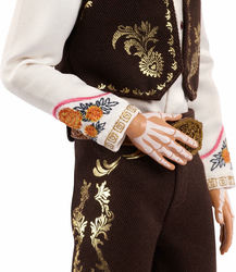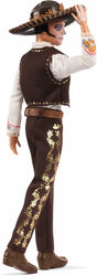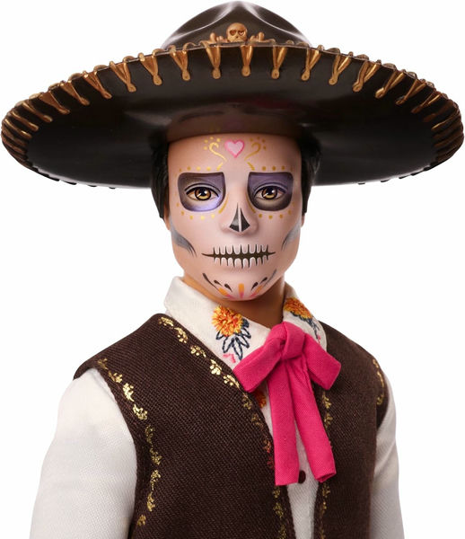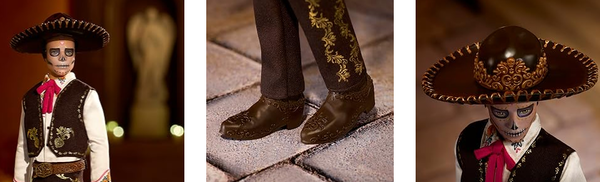 Кен одет в элегантный темный костюм с золотыми декоративными элементами, белую рубашку и ярко-красный галстук. Образ завершается традиционным сомбреро и фирменным рисунками Дня мертвых.