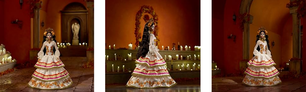 Платье куклы Барби создано по мотивам цветка календулы, который традиционно используется в мексиканской культуре для украшения алтарей и могил близких людей. В знак теплого приема как живым, так и умершим, эти цветы украшают лиф и подол платья, а также корону, обрамляющую поразительно раскрашенное лицо куклы. Ее кремовое платье с оборками отделано яркой лентой и фестончатым золотым кружевом. Прозрачные рукава-блузоны создают изящный контраст с массивными серьгами-каплями и многослойными ожерельями.