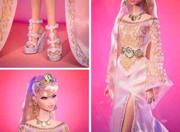 Барби в образе Фортуны из Белого золота одета в потрясающее платье, демонстрирующее скульптурную фигуру Одиллии с распущенными серебристыми волосами. Ее образ выполнен в бело-золотой цветовой гамме, с изысканной филигранной вышивкой, плиссированными вставками и эффектным разрезом спереди. Корона из золотых медальонов, украшения в тон и позолоченные туфли дополняют этот царственный дизайн, вдохновленный богиней.