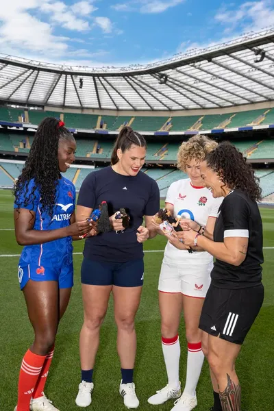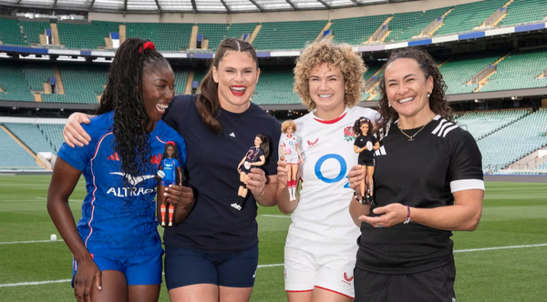 Слева направо: француженка Нассира Конде, американка Илона Махер, англичанка Элли Килдан и новозеландка Порша Вудман-Уиклифф со своими новыми, единственными в своем роде куклами Барби на стадионе Allianz в Твикенхэме, Лондон, 13 сентября 2025 года.