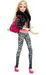 Эта кукла - 2015 года, и она отражает модные тенденции нового сезона: в тренде - узкие джинсы с принтом, топы, короткие лакированные курточки и жакеты, широкие браслеты.
