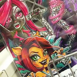 Тона Catty Noir здесь - чёрный, серебристый, розовый (волосы розовые, под цвет отделки костюма). Тона Toralei Stripe - рыжий, чёрный, голубой, этот вариант Торы отличается очень эффектной причёской.