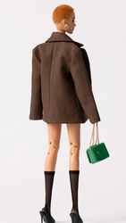 Модный комплект: Кружевное белье с поясом на подвязках, Тренч оливкового цвета в британском стиле, Футболка в черно-белую полоску с длинным рукавом, Брюки из твила цвета экрю с поясом из веганской кожи. Аксессуары: Золотые серьги Huggie, Сумка через плечо из искусственного крокодила, Туфли-лодочки из искусственного крокодила, Подставка для куклы, Сменные руки, Номерной сертификат подлинности.