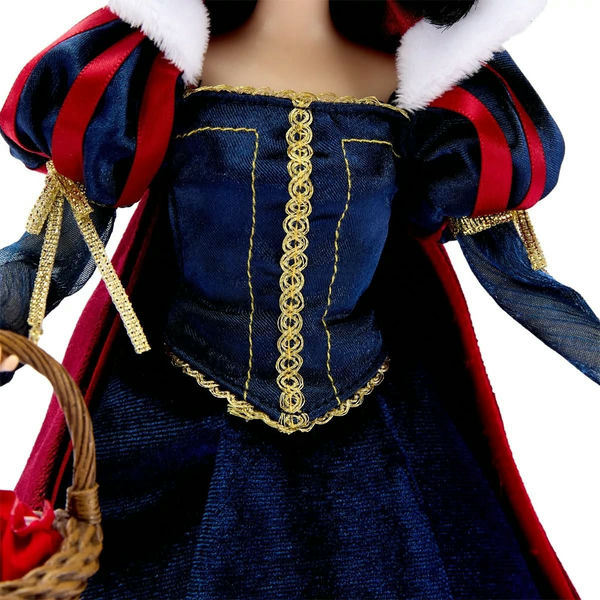 У куклы короткие черные волосы с красным бантом и длинное темно-синее бархатное платье, украшенное золотой вышивкой и красными деталями. Платье с пышными рукавами в полоску и облегающим лифом дополнено просторной накидкой из красного бархата с капюшоном, отороченным белым мехом. В руке она держит небольшую плетеную корзинку, прикрытую красной тканью.