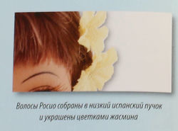 Волосы цвета темной меди украшает скромный букет из бледно-желтых цветков жасмина. Все эти элементы придают фигуре Росио изящество, легкость и воздушность.