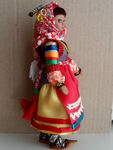 Она вся не очень, никакушная. Коса сделана по-дурацки, на лбу блямба из волос и клея, как на затылке шведки, блямба чуть прикрыта повязкой, но очень отчетливо видна. Сапожки красные, ткани хилые какие-то, ничего не выражают, по цвету никак не сочетаются. Украшений нет, ноги на ширине плеч, надо перетягивать. Если переделать с нуля, то можно брать для творчества. Если сразу ставить на полку, то она проигрывает рядом с другими куклами.