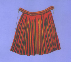 Юбки были из однотонной ткани (либо с мелким рисунком), их украшали тонкими цветными атласными лентами, характерным для этого региона «зигзагом». Фартуки делали из такого же материала, что и юбки, но они были на 20 см короче.