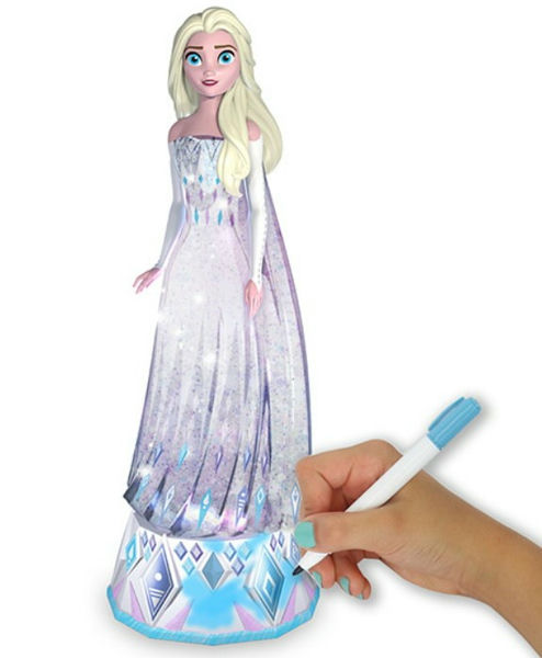 Она включает в себя наклейки зимней тематики (бриллианты и снежинки), маркеры и блестки, которые дети могут добавить на платье Эльзы и украсить основу игрушки. Блеск поставляется в сжимаемой трубке с кончиком, как у кисти, что позволяет легко и аккуратно красить блеском, который не будет разлетаться вокруг.
