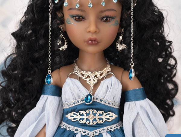 Готовьтесь к тому, что вас очарует Лоренна, старшая кузина Друзиллы, императрицы Драконов! Эта могущественная девушка обладает магией, которая влияет на Луну и океаны. Ее потрясающий топ на бретелях и многослойная юбка, украшенные сверкающей повязкой на голове и темно-синими стразами, излучают элегантность.