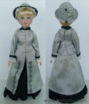 Эстелла Хэвишем - Дама Эпохи, моя кукла-полячка. Рисунок - не вышивка, печатный. Из-под чёрного воротничка жакета виднеется кружевная блузочка. Манжеты - с кружевом. Кружево хорошее, настоящее плетёное, не синтетика. Это же кружево и на шляпке.
