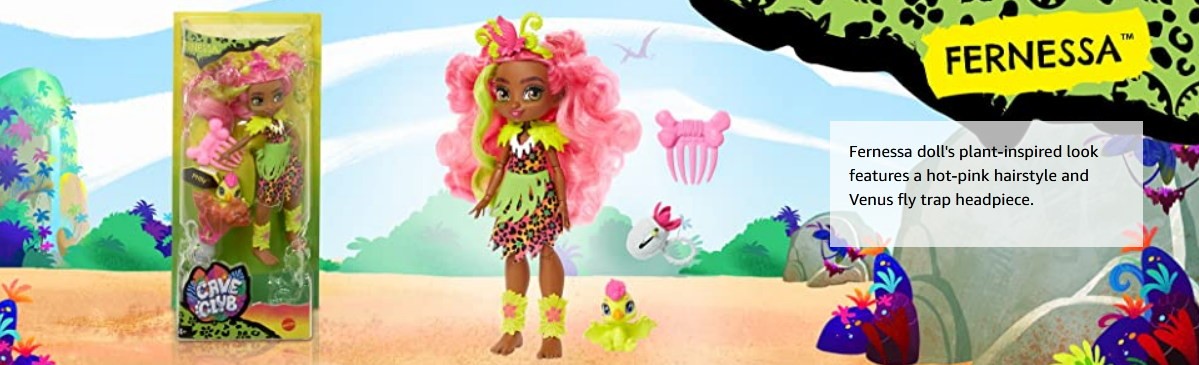 Фернесса (Fernessa) - одна из главных героинь кукольной линии Cave Club. В самом начале серии в 2020 году мы можем встретить ее в базовой версии, в делюкс-версии (с прядью волос, в остальном как базовая), и с игровым набором на тему няни и малыша. Игровой набор особенно примечателен, потому что здесь будет еще одна кукла - доисторическая малышка!