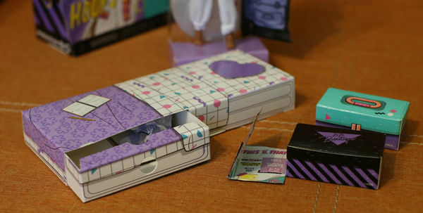 После того, как мы все открыли и распаковали, выяснилось, что в комнате есть шкафчик, он же кровать (картон). Плюс две картонные коробки для мелочей. Внутри шкафа есть большой выдвижной ящик сбоку (в нем находится один из сюрпризов). Если шкаф положить, мы видим перед собой кровать!