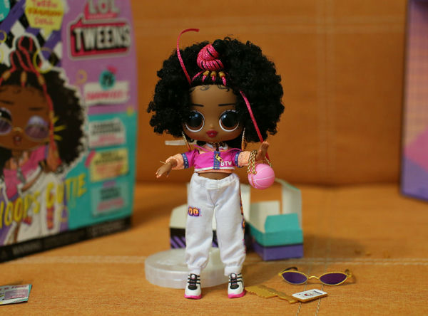 Итак, кукла L.O.L. Surprise Tweens Hoops Cutie - сестренка-подросток с темными кудрявыми афро-волосами и карими глазами. Одета в спортивный персиковый топ, есть также короткая розовая толстовка, белые удобные широкие штаны и кроссовки.