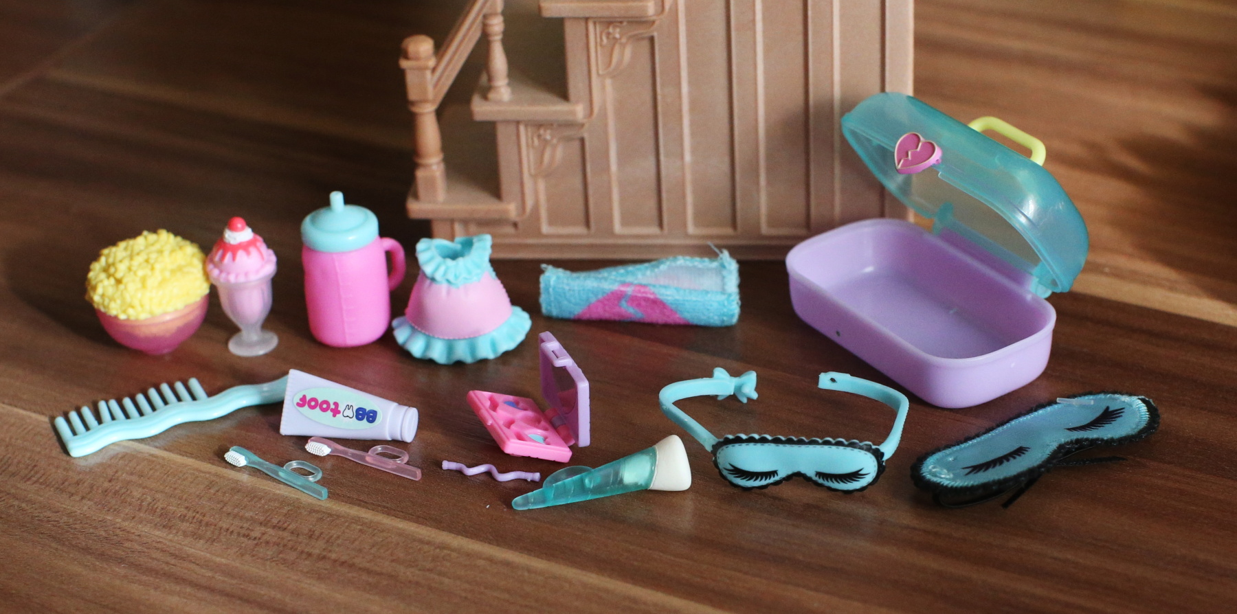 В наборе, к счастью, есть большой удобный косметический чемоданчик, в который умещается все, включая расческу и маски для сна. Не умещается только платье для куклы-малышки, ее бутылочка и еда, но это и логично, им там не место А вся косметика - в ящике-чемоданчике, защелкивается, ничего не потеряется: