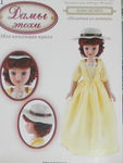 КУКЛА ВЫШЛА. Платье простого покроя, светло-жёлтое, на голове - шляпка, мягкая, с коричневой ленточкой на тулье.