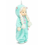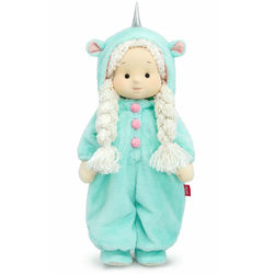 Текстильная кукла Аврора с двумя косами из буклированной пряжи призрачно-белого цвета. На Авроре классное свободное кигуруми «Единорог». Кигуруми сшито из мягкого короткого меха цвета ледяного стекла, спереди на кнопках, оформленных розовыми помпонами. Капюшон с серебристым рогом Единорога и ушками, внутри которых вшит нежно-розовый софт. Низ рукавов и штанишек собраны на резиночки. На ножках у Авроры милые мягкие сапожки из основного меха, с подошвой из плотного молочного цвета флиса.