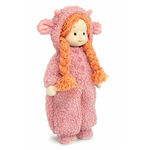 Текстильная кукла Ива с двумя косами из буклированной пряжи мандаринового цвета. На Иве классное свободное кигуруми «Овечка». Кигуруми сшито из мягкого кудрявого меха цвета розовой пудры, спереди с застёжкой на три пуговки в тон. Капюшон с маленькими рожки и ушками, внутри которых вшит нежно-розовый софт. Низ рукавов и штанишек собраны на резиночки. На ножках у Ивы милые мягкие сапожки из основного меха, с подошвой из плотного молочного цвета флиса.