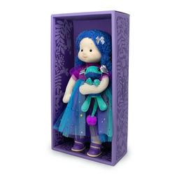Текстильная кукла с волосами из буклированной пряжи призрачно‑белого цвета. Волосы заплетены и скреплены сзади в косу. На Авроре молочного оттенка платье из плотной ткани с люрексом. Также на Авроре нежное пальтишко цвета голубого льда с деликатным блеском. Пальто оторочено коротким белоснежным мехом. Белый воротник из более высокого и пушистого меха. На ножках у Авроры ботиночки из серебристой экокожи. Ботиночки завязываются на шнурки, а подошва с фирменным логотипом. Голову Авроры «Снегурочки» украшает шикарная корона из глиттерного материала с блестящими крупными снежинками.