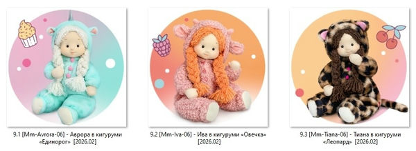 Очаровательные куколки Minimalini в кигуруми: Аврора «Единорог», Ива «Овечка», Тиана «Леопард».