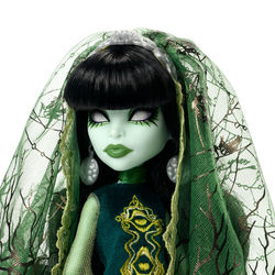 Новая кукла Mattel Scarah Screams переосмысливает персонажа через призму кельтской банши, превращая миф и символику в визуальный дизайн. Бархатное мини-платье украшено симметричной пугающе-милой вышивкой банши, выполненной в виде стилизованных открытых ртов, изображающих скорее крики, чем глаза. Также в узор вплетены маленькие черепа, напоминающие о предзнаменованиях смерти и призрачных отголосках. Прозрачный саван выполняет функцию ритуального покрывала, усиливая идею присутствия погребального существа, перемещающегося между мирами, в то время как его узоры в виде ветвей перекликаются с лесами и древним фольклором.