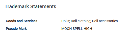 Ведомство по патентам и товарным знакам США (USPTO) присвоило торговой марке MOONSPELL HIGH серийный номер #99239073. Присвоенный серийный номер товарного знака - это уникальный идентификатор для идентификации заявки на товарный знак MOONSPELL HIGH в USPTO. Основанная компанией MATTEL, INC., торговая марка MOONSPELL HIGH будет использоваться в следующих сферах бизнеса: Куклы; Одежда для кукол; Аксессуары для кукол.