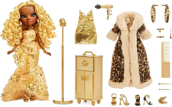 Кукла приходит в великолепном бальном платье с вышитыми пайетками + деталями из органзы, подходящими золотыми туфлями, заколками для волос и золотыми украшениями. Поставляется со вторым полным нарядом - длинное пальто из искусственного меха с принтом гепарда, платье из золотой фольги с деталями в виде животных и черные босоножки с золотой цепочкой + подвески.