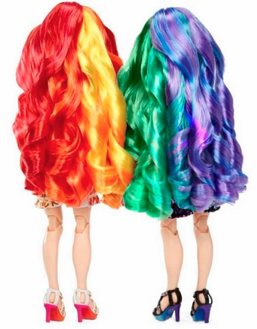 Если поставить их рядом, то у них в волосах вы обнаружите все цвета радуги. У одной куклы - красный, оранжевый, желтый. У другой - зеленый, синий, фиолетовый цвета.