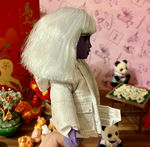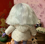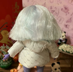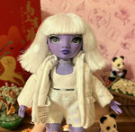 - кукла необычная. У нее яркая фиолетовая кожа, платиново-белые (с легким дополнением светло-голубого) волосы и очень эффектный и стильный белый наряд: сетка-боди, белое боди-маечка, шорты и толстая-толстая зимняя куртка. На ногах - потрясающие ботинки с сумочками!