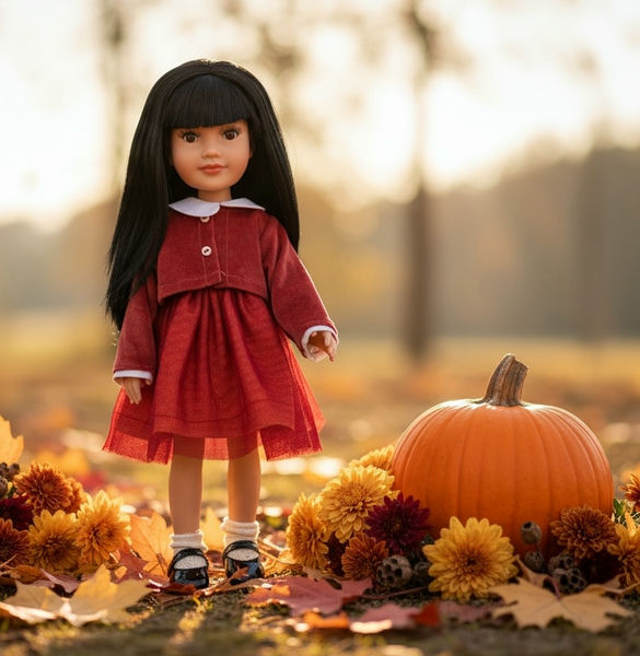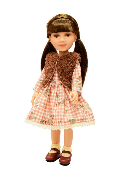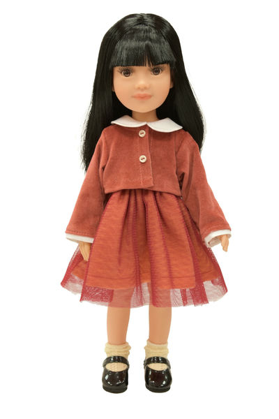 Евгения с прямыми черными волосами и карими глазами. Кукла в лаконичном платье, декорированном легкой сеткой из